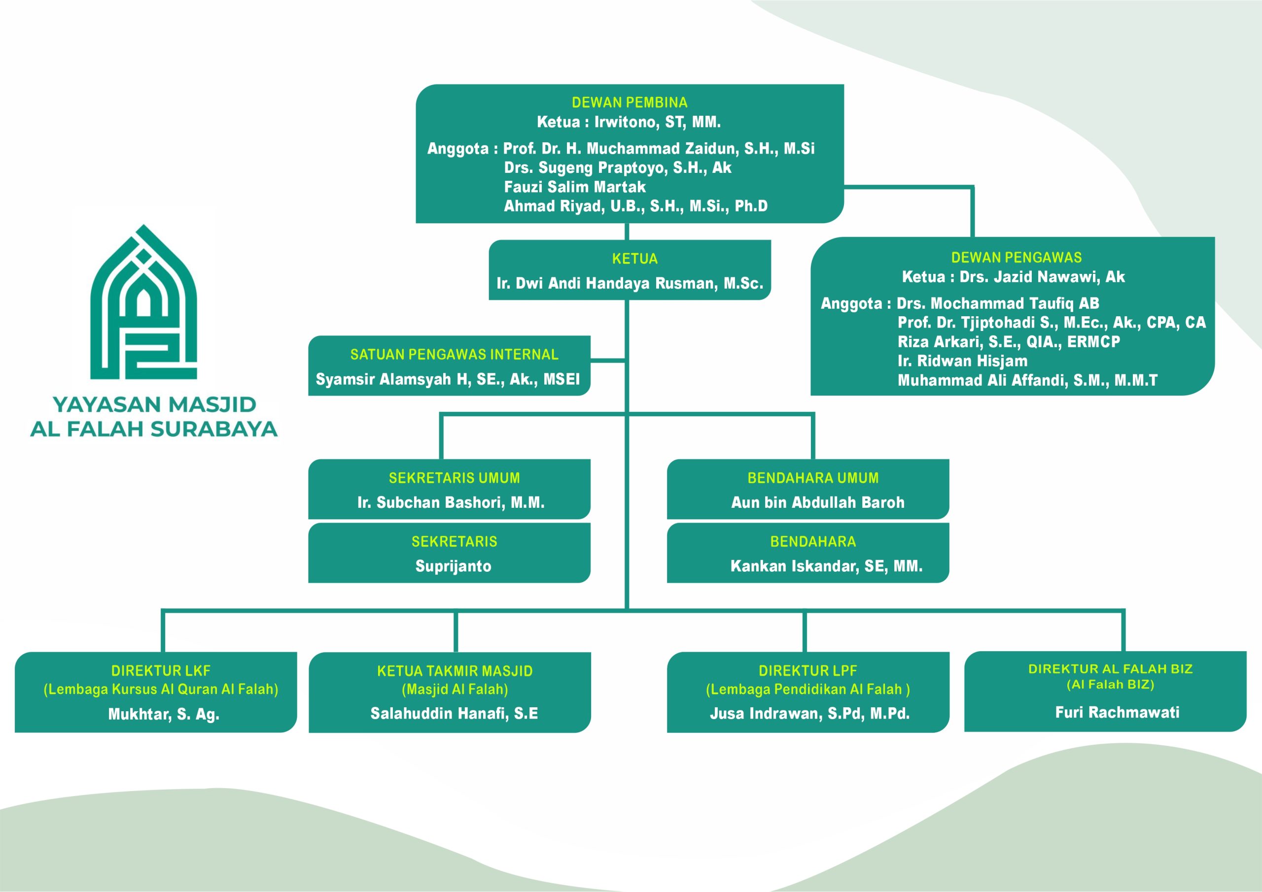 Secara legal Organ Yayasan Masjid Al Falah Surabaya terdiri dari: Pembina, Pengawas dan Pengurus. Dan ditambah dengan kekhasan Al Falah, yaitu Dewan Syariah.